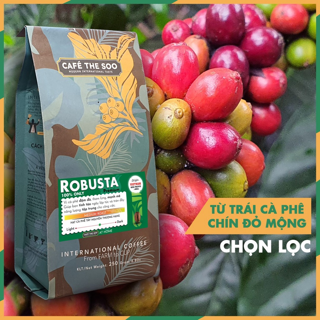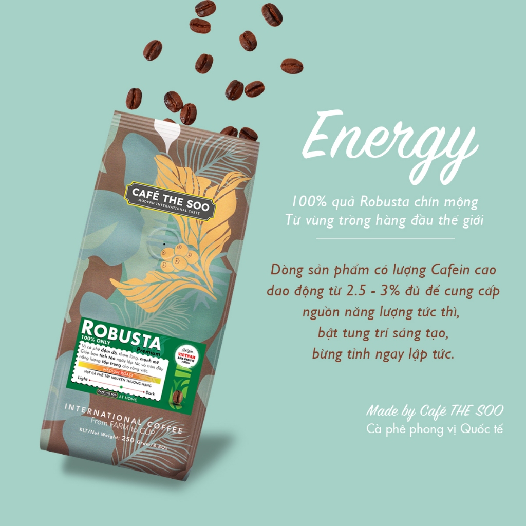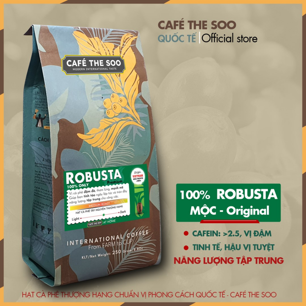 ロブスタ種のコーヒーは、その高いカフェイン含有量(約3〜4%)により、深い苦味と力強いアロマを楽しめる一杯を提供します。Café THE SOOでは、100% 熟した果実のみを選別し、伝統的な手法で焙煎しており、その香り高い風味を最大限に引き出しています。また、特別な空気乾燥法と発酵処理により、コーヒーの品質を保持し、風味が長持ちするよう工夫されています。