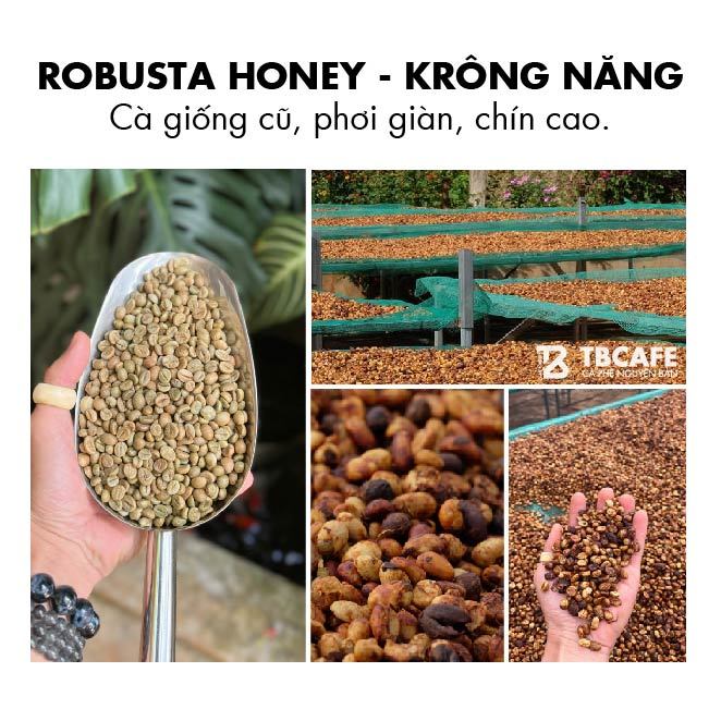 「ロブスタハニーコーヒー」は、TBCAFEが厳選したロブスタ種のコーヒー豆を使用し、特別なハニー製法で丁寧に仕上げられた100%純粋なコーヒーです。ベトナムのクロンナン - ダクラク地域、標高800メートルで栽培されたこのコーヒーは、成熟した果実の甘みを最大限に引き出すために、果肉の粘液層を残したまま天日乾燥され、蜂蜜のような豊かな風味と甘さが特徴です。この伝統的な製法により、キャラメルのような甘い後味と深いコクを持つ、フルーティーで滑らかな一杯が楽しめます。