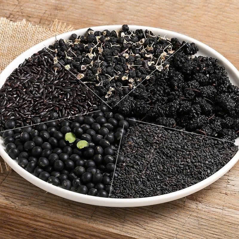黒ゴマ、黒桑の実、黒クコの実、黒もち米、緑芯黒豆(全て低温乾燥)