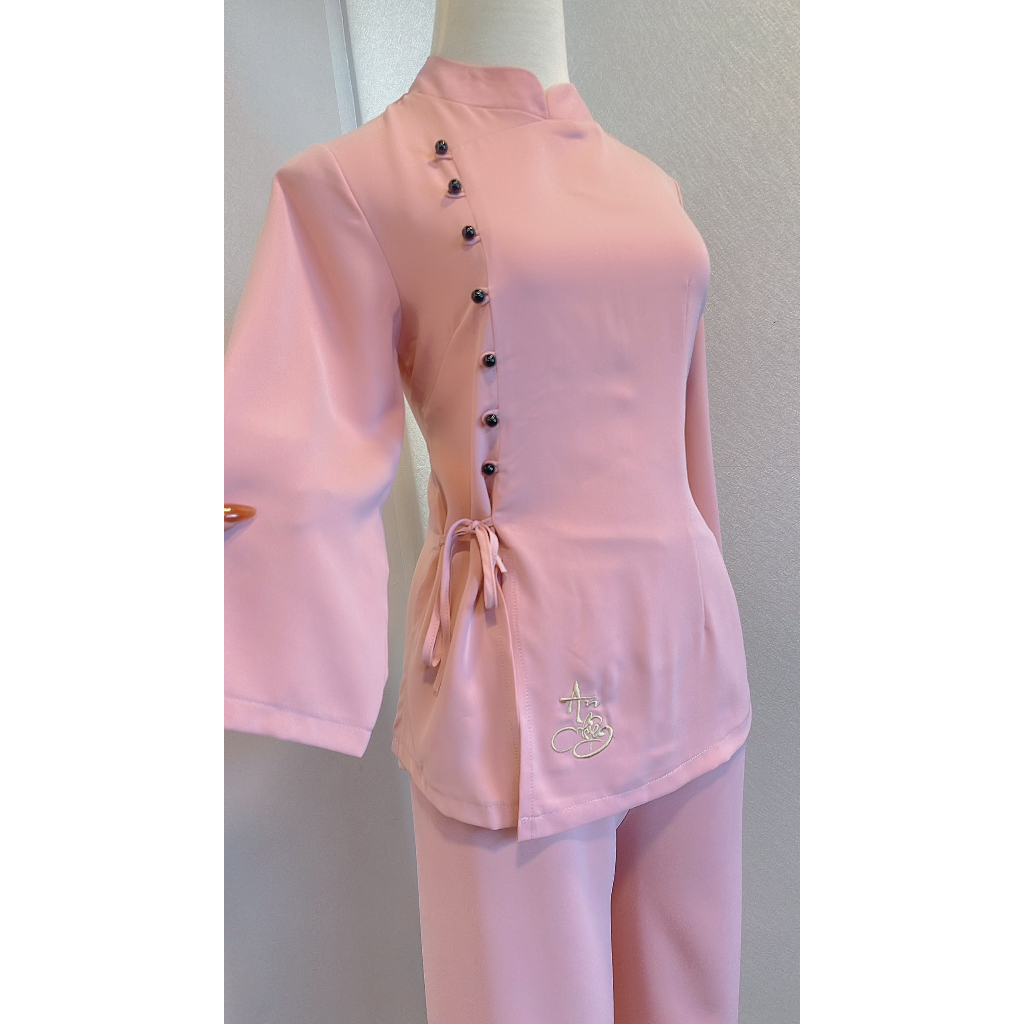 トップスは伝統的なスタンドカラーと長めの着丈で、すっきりとした印象を与えます。パンツは程よいワイドシルエットで、動きやすさと上品さを両立しています。カフェでのお出かけ、お寺参り、普段使いなど、様々なシーンで活躍する一着です。