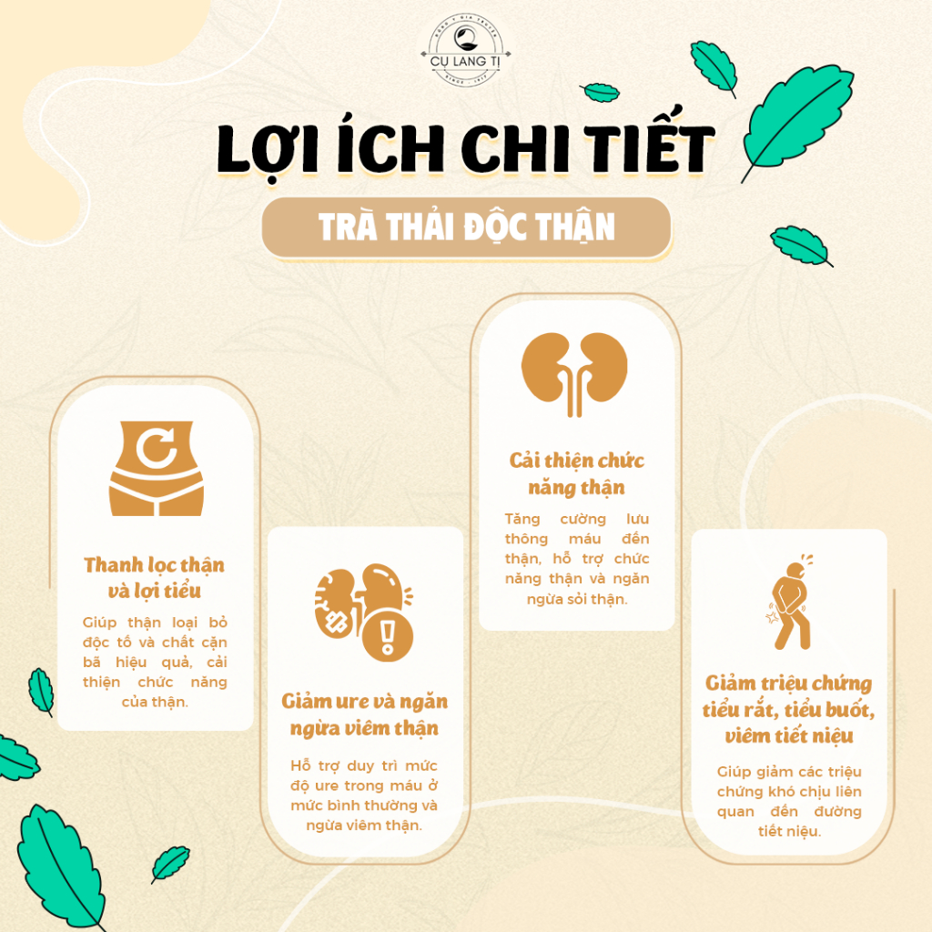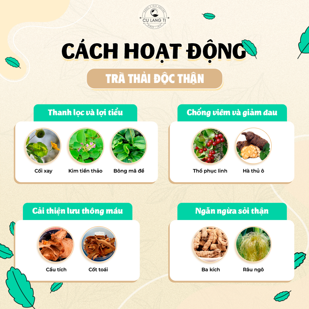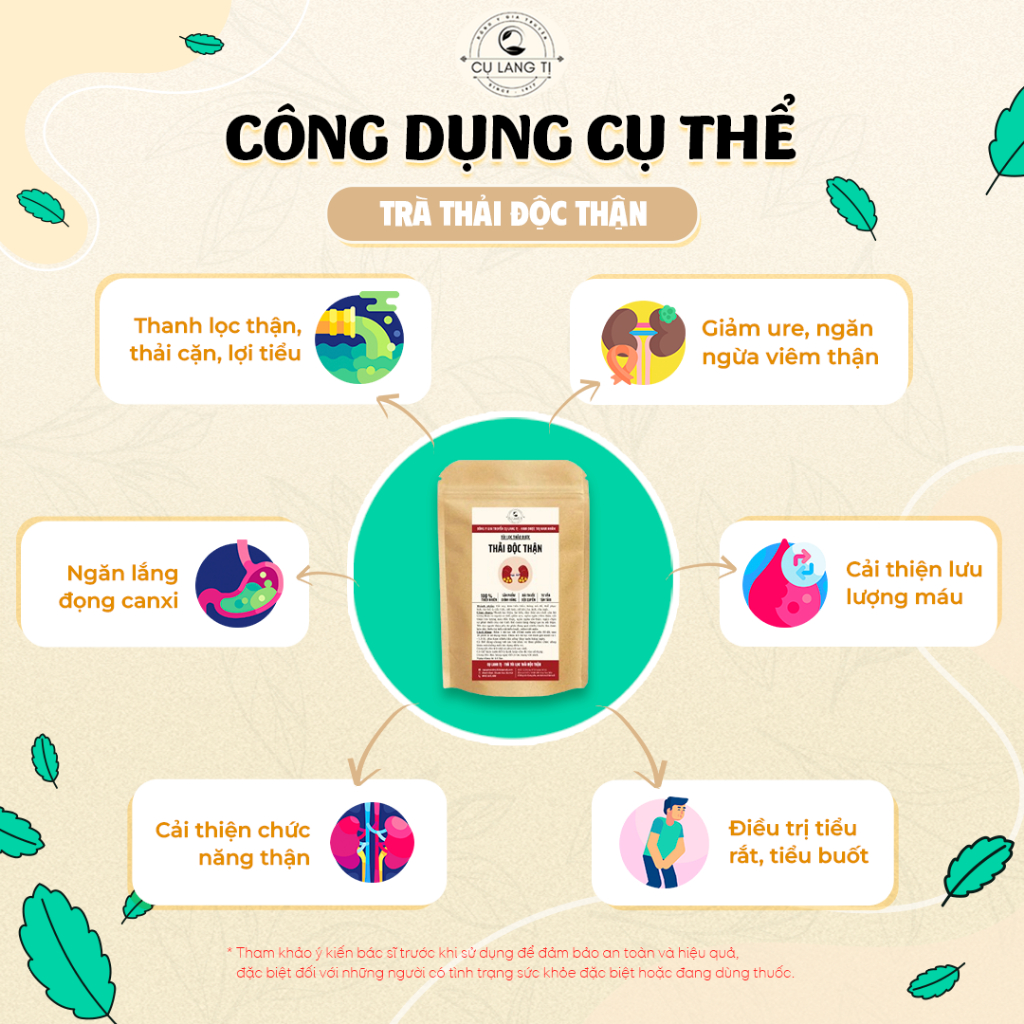 「Cụ Lang Tị トラ タイ ドック トン」は、腎臓のデトックスと健康をサポートする伝統的なハーブティーです。このお茶は、腎臓の機能を強化し、尿の排出を促進し、体内の老廃物を排出する効果があります。さらに、血中の尿素値を低下させ、腎臓の健康を維持するために重要な役割を果たします。5~7日間の使用で効果が実感でき、長期的に使用しても効果が持続するため、安心して利用できます。
