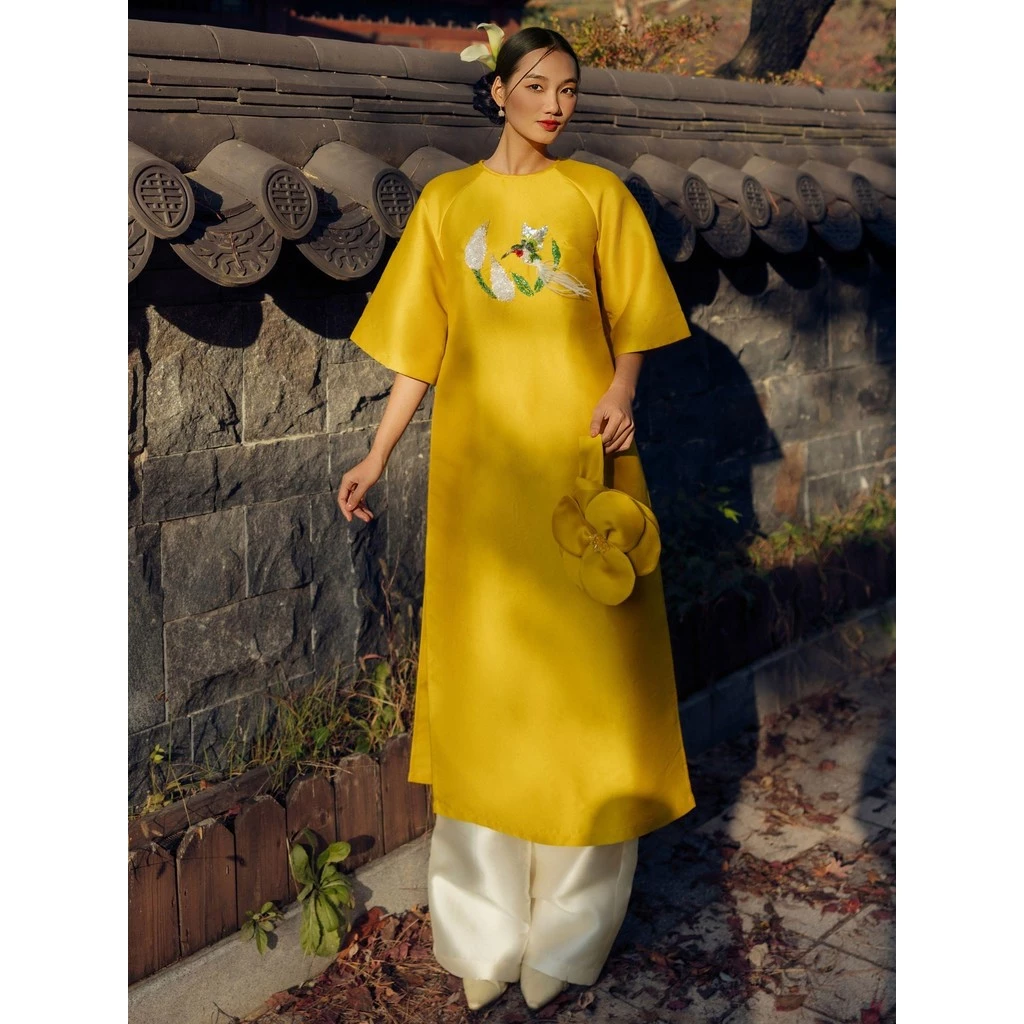JOVEN Elegant Women's Ao Dai for Tet | 3D Bird & Floral Wreath Embellishment (Pants Not Included)