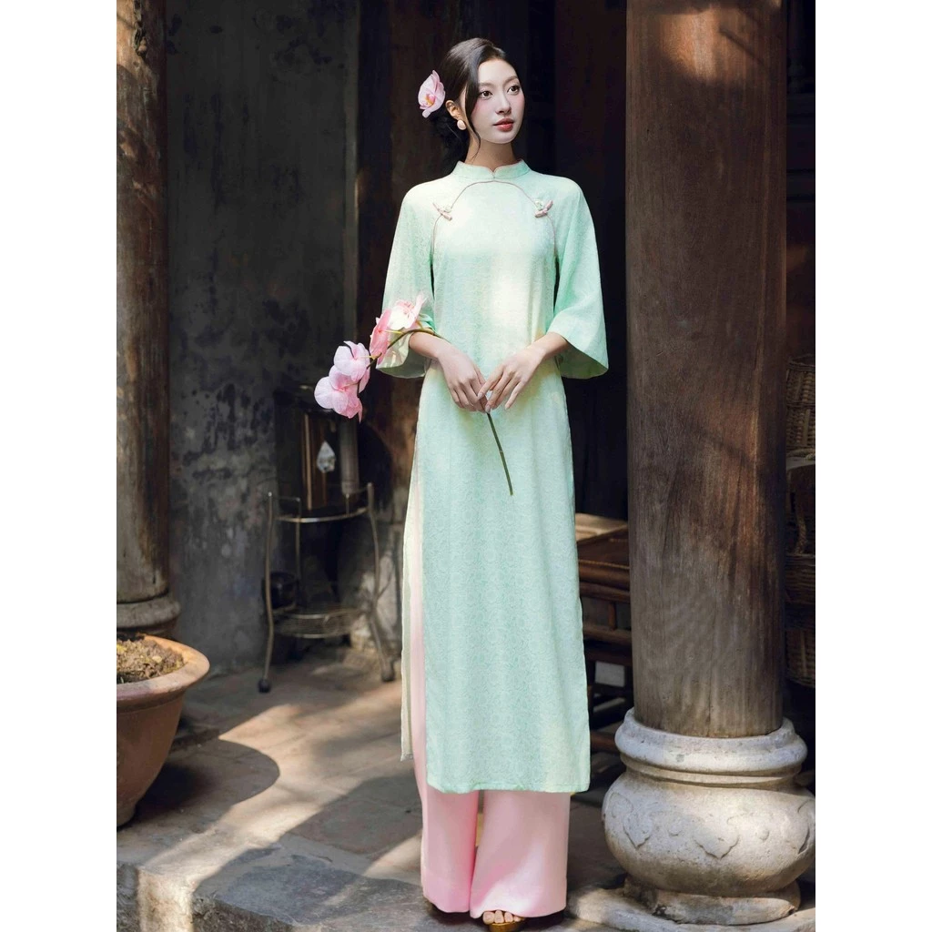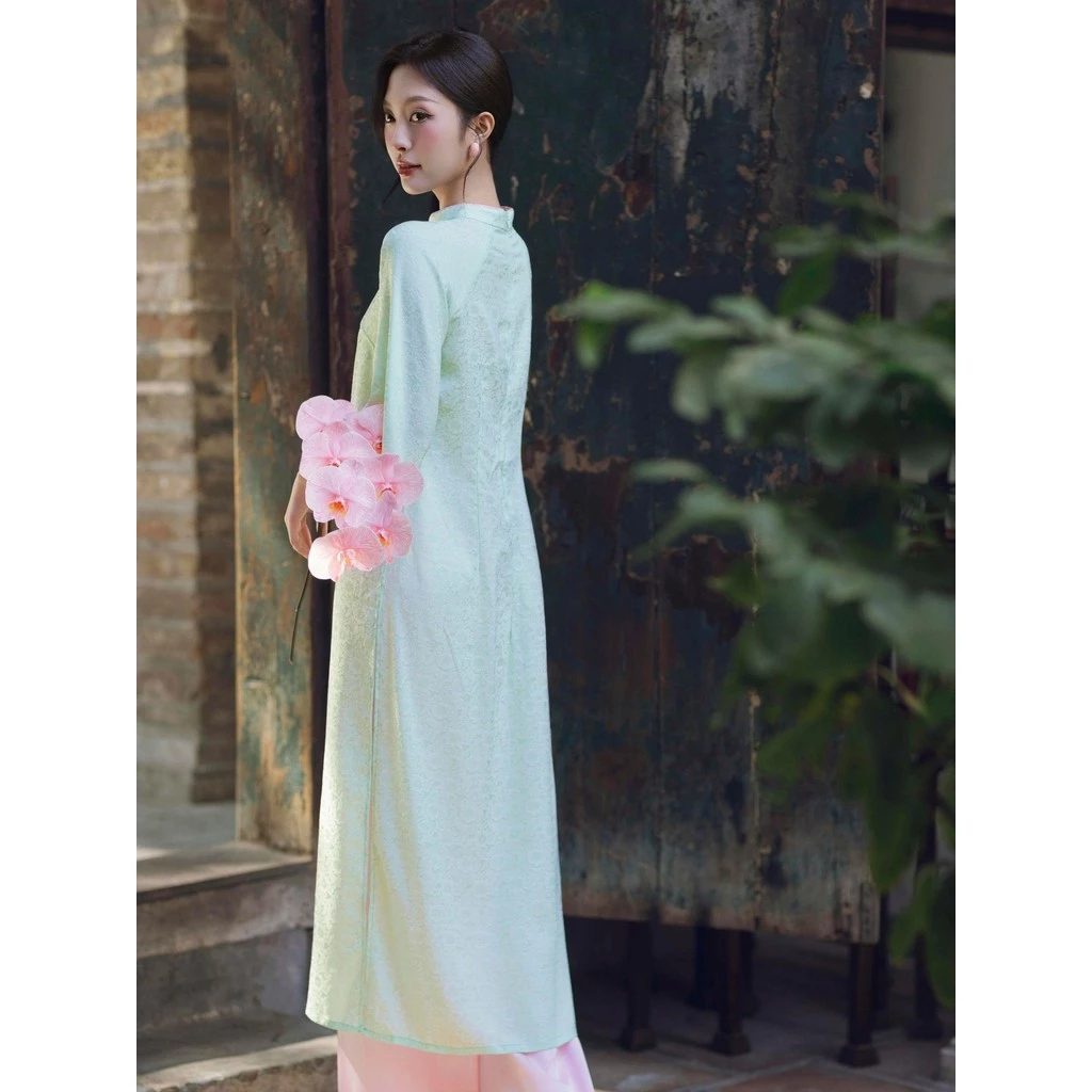 JOVEN Minh Khue Women's Elegant Mandarin Collar Ao Dai with Subtle Floral Embossing (Pants Not Included)