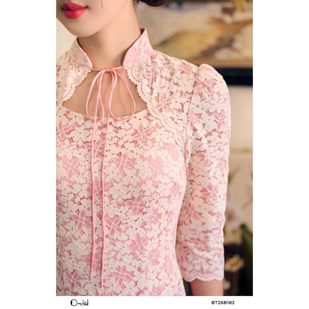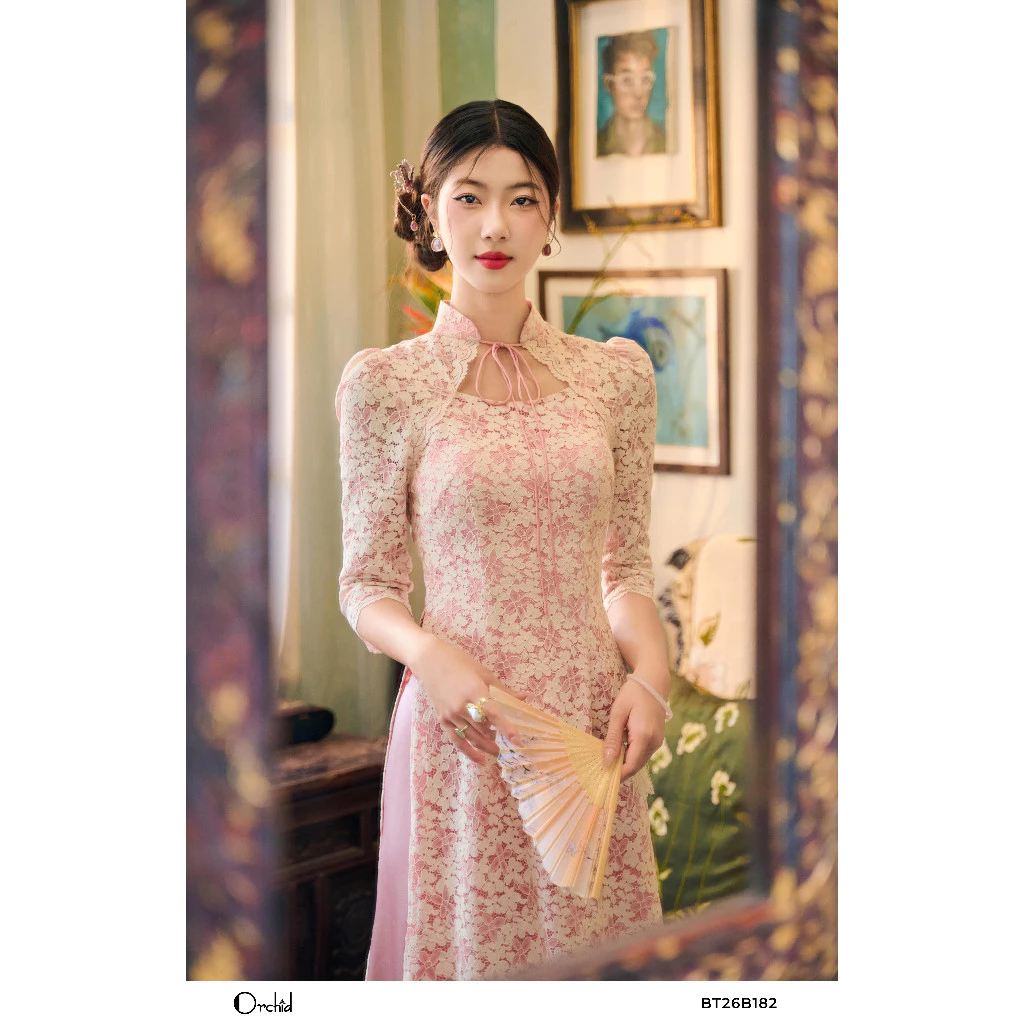 Orchid 3D Floral Lace Ao Dai Set with Bow-Knot Neck and Half Sleeves - BT26B182