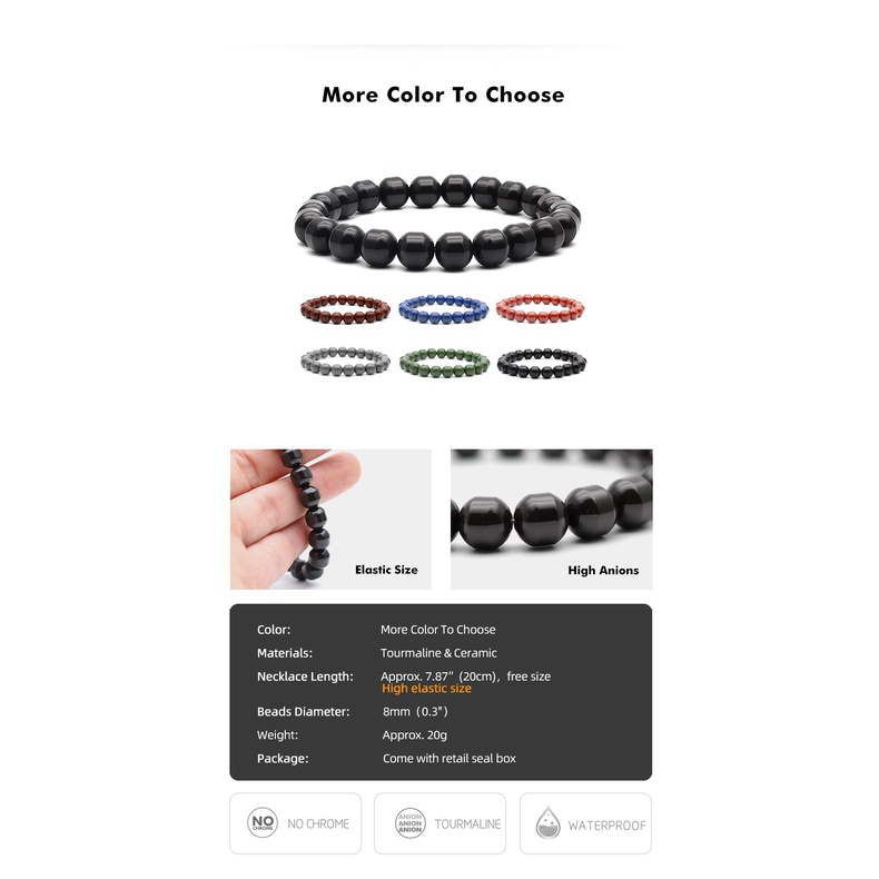 ブレスレットは男女問わず使用できるユニセックスデザインで、伸縮性のある構造により、さまざまな手首のサイズにフィット。トルマリンの粒が肌にしっかりと接触することで、より効果的にその特性を発揮すると言われています。軽くて柔らかい着け心地のため、日常的にストレスなく着用できます。