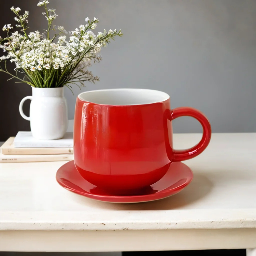 セットに含まれるコップ、ソーサー、スプーンは、それぞれが統一感を持ったデザインで、全体としてバランスの取れた美しさがあります。特に、コップは持ちやすく、飲み口も適度に開いていて、飲み物の香りをしっかりと楽しめる形状です。また、ソーサーはコップをしっかりと支える形状で、安定感があり、テーブルに置いたときに美しさを引き立てます。小さなスプーンも使いやすく、見た目にもシンプルでありながら洗練されています。