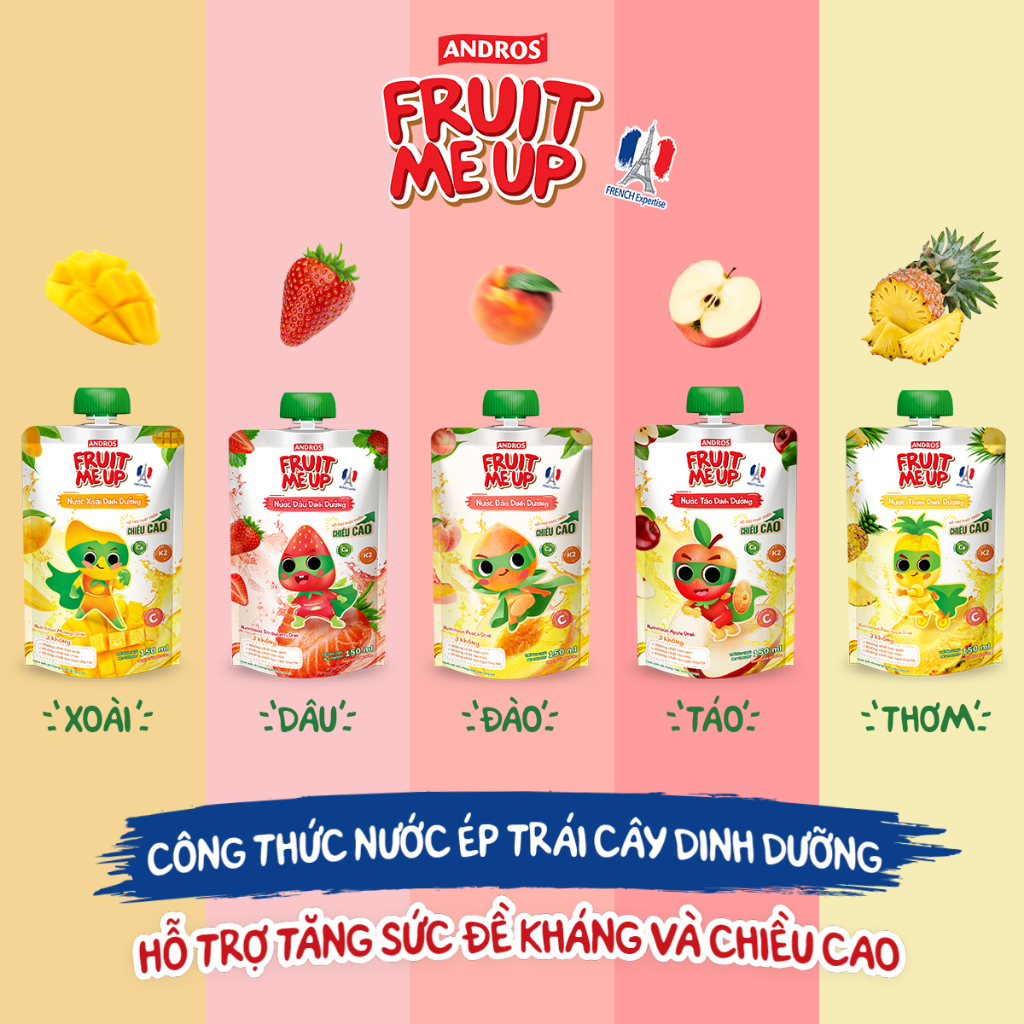 ANDROS FRUIT ME UP 栄養果実ピューレ(いちご味)は、お子さまの健やかな成長と健康をサポートするために開発されたフルーツピューレです。100%天然果実を使用し、甘味料や保存料、着色料を一切加えず、安心して与えられる品質を実現しました。カルシウム、ビタミンD、ビタミンCなど、子どもの成長に欠かせない栄養素がバランスよく含まれています。