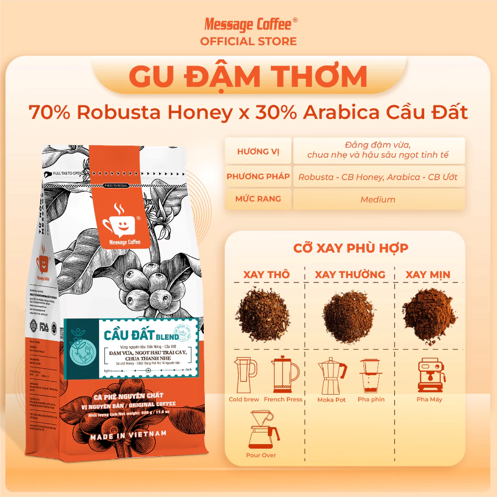 “Message Coffee” Cau Dat Blend 100% Pure Roasted Coffee Powder 200g - Alluring Aroma & Sweet Bitter Aftertaste, Fine Grind for Machine Brewing