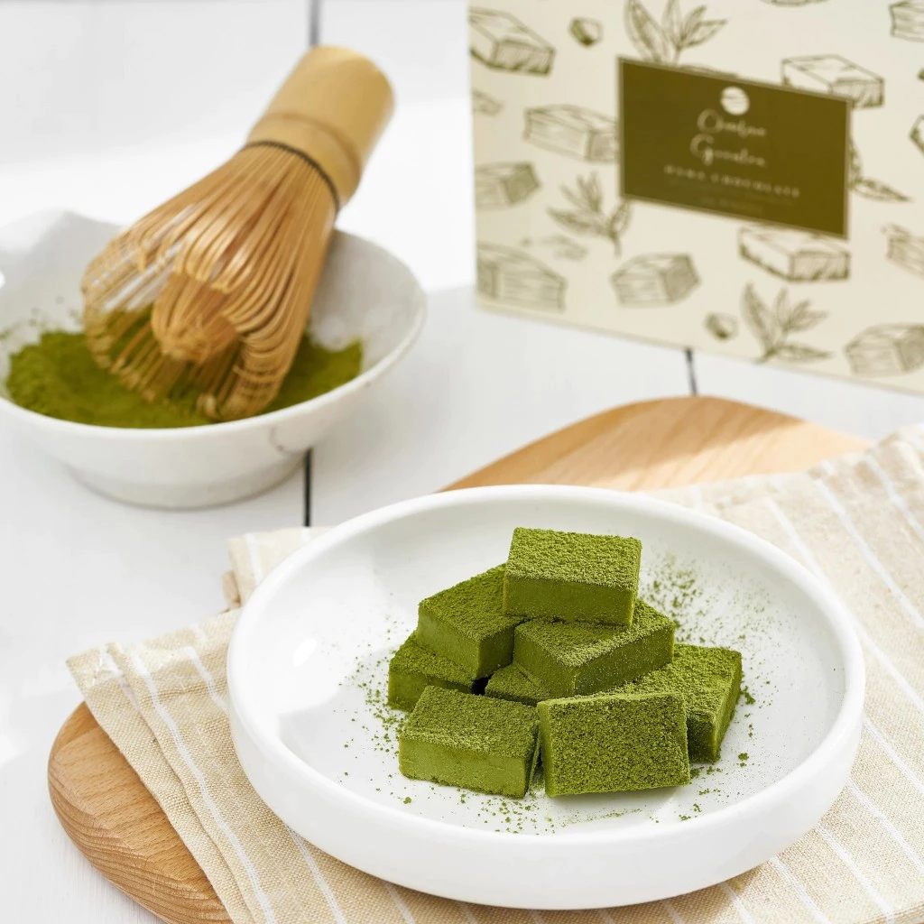 職人の手で一つ一つ丁寧に作られたキューブ型の生チョコレートは、加熱処理を最小限に抑えることで、カカオ本来の豊かな風味と湿度を保っています。表面には、風味豊かな抹茶パウダーがたっぷりとまぶされています。