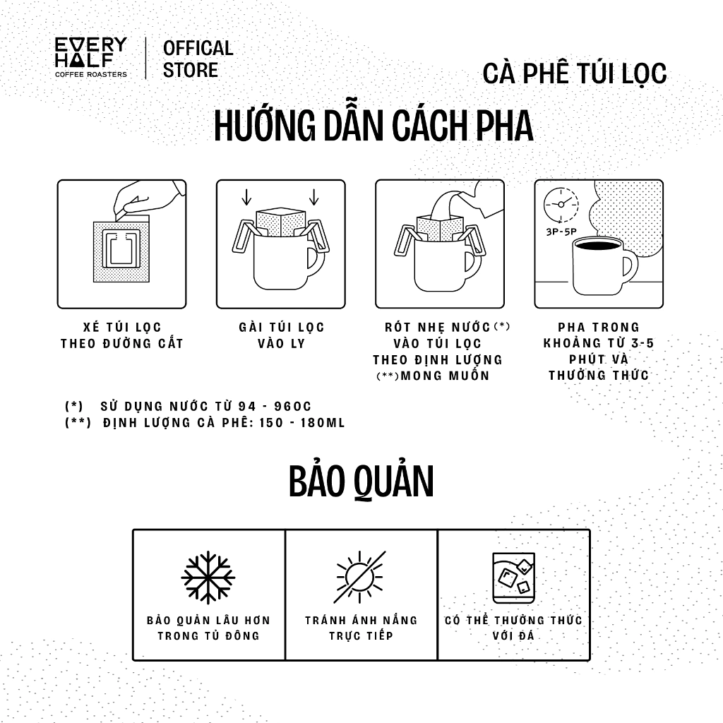 コンボセットには、Every Half の代表的なコーヒーが6種類含まれています。例えば、コスタリカ、ブラジル、ケニア、ディエンビエン省産カティモール、ラオス産ティピカ、ダクラク省産ファインロブスタなど(内容は時期によって変更される場合があります)。