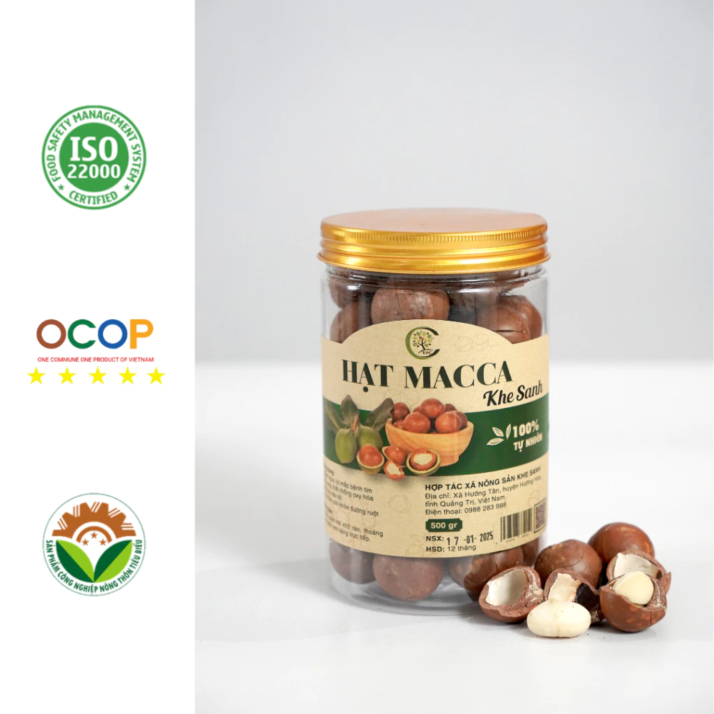 「Hạt Macca Organic Khe Sanh - Quảng Trị」は、ベトナムのクアンチ省ケサン地方で収穫された高品質な有機マカダミアナッツです。