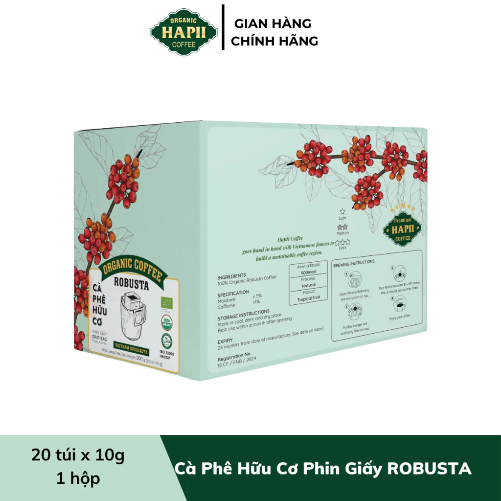 この製品は、化学物質を一切使用せず、清潔な基準で栽培・加工されたオーガニックロブスタコーヒー豆を使用しています。コンパクトなドリップバッグ(Drip Bag)設計により、複雑な器具を必要とせず、わずか数分で本格的なベトナム式コーヒー(Phin Coffee)を淹れることができます。忙しいビジネスパーソン、旅行愛好家、時間がない方々に最適です。