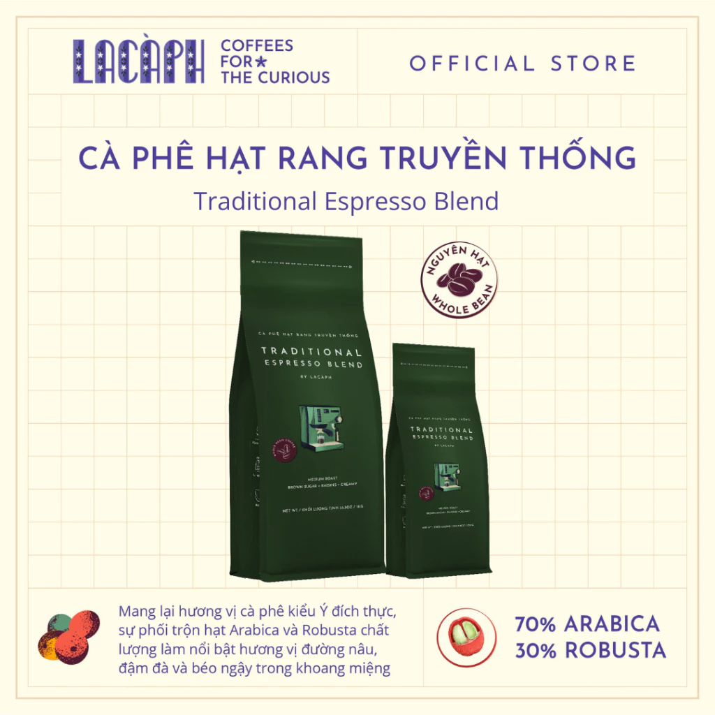 「Lacàph トラディショナル エスプレッソブレンド」は、ベトナムの厳選された高品質なコーヒー豆(ラムドン省ラックズオン産アラビカ、ラムハ産ロブスタ)を使用した、本格的なイタリアンスタイルのエスプレッソコーヒーです。