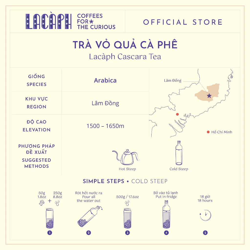 ベトナムのラムドン省にある高品質なアラビカ農園( Ngọc Farmなど)から厳選された原料を使用し、収穫されたコーヒーチェリーの皮は24時間以内に発酵させ、その後、天日で丁寧に乾燥されます。この自然な製法により、添加物を一切使用しない、純粋なカスカーラの豊かな風味と栄養が最大限に引き出されます。
