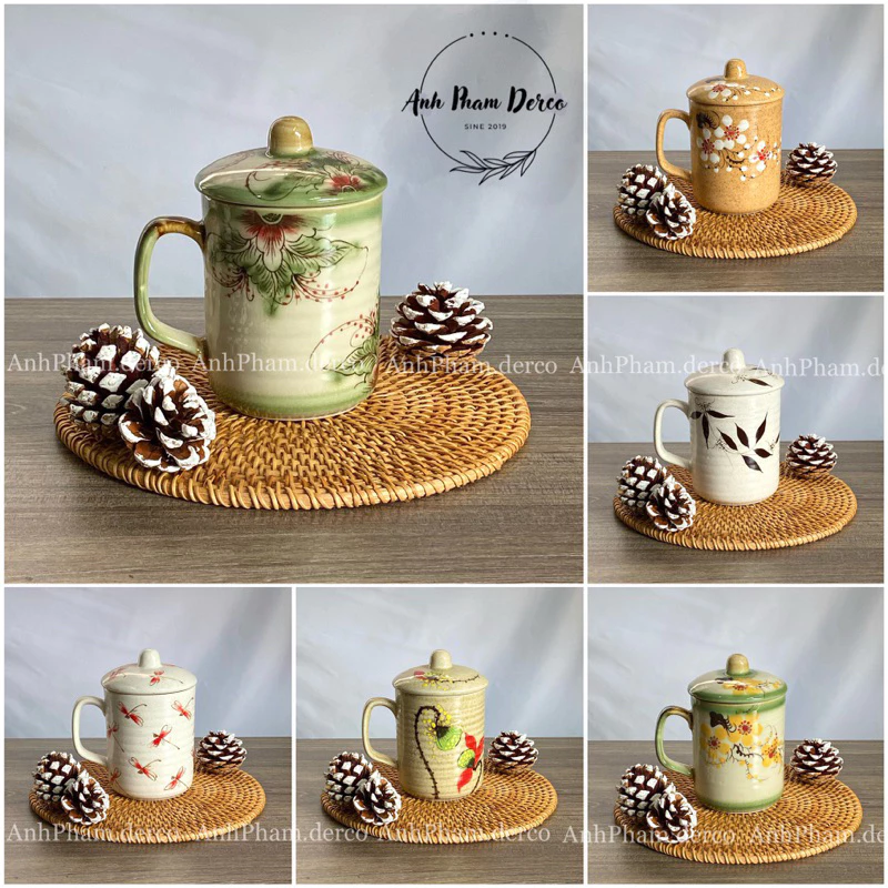 Bát Tràng Hand-Painted Hibiscus Ceramic Mug with Lid - 350ml