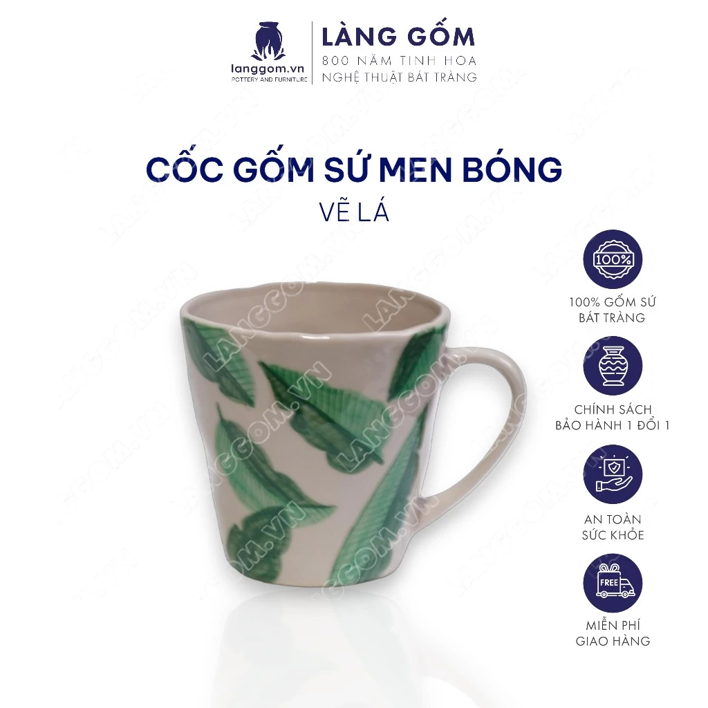 LÀNG GÔM" Bat Trang Premium Hand-Painted Ceramic Mug with Elephant & Leaf Patterns, Glossy Glaze, 200-350ml