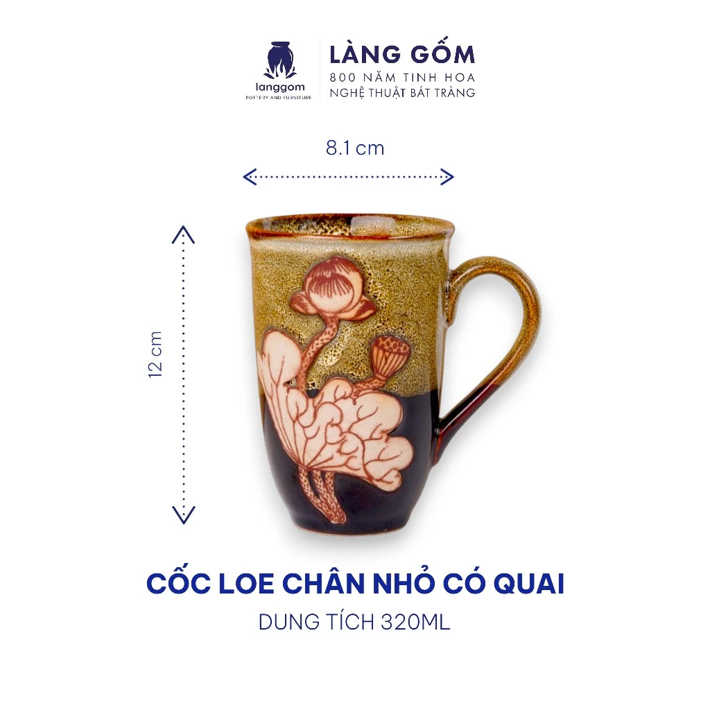 Bat Trang Flame-Glazed Ceramic Mug with Handle for Coffee, Tea, Water - Flared Small Base Design - 250ml & 320ml - Lang Gom Pottery