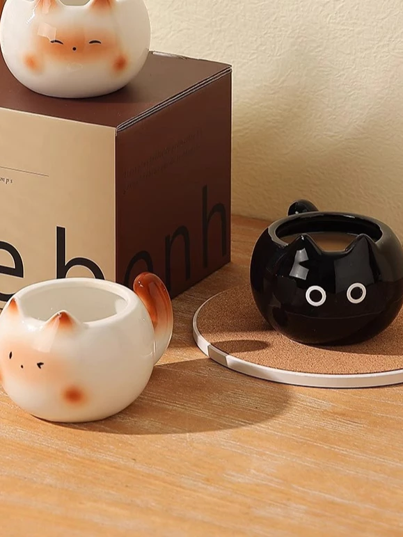 蓋と3Dの耳: 一部のマグカップには陶器製の蓋が付属しており、さらに2つの尖った猫の耳(3D)が盛り上がってデザインされています。これにより、カップが完全な猫の顔に変身します。このディテールは、美的魅力を高めるだけでなく、飲み物の温度をより長く保つのにも役立ちます。