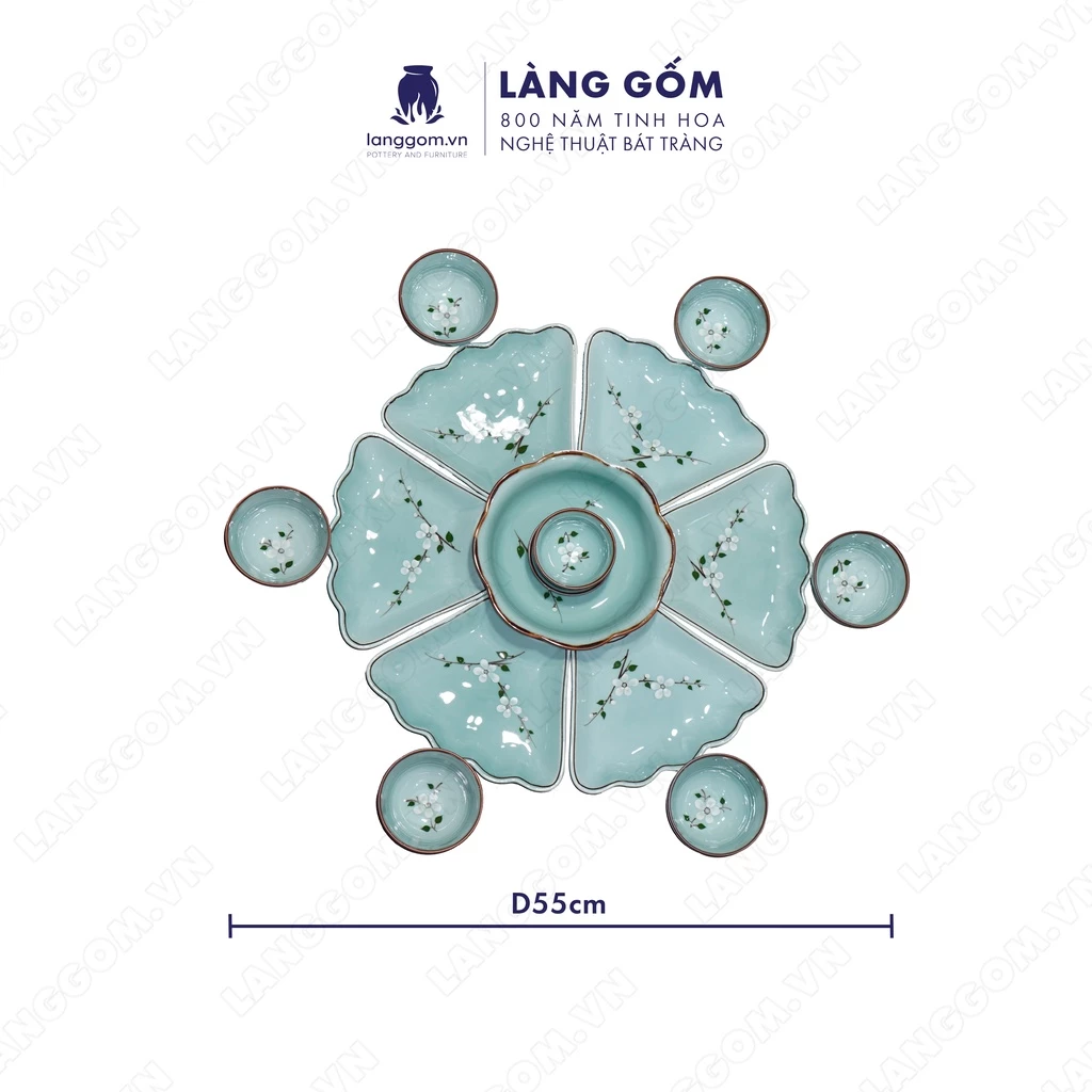 LÀNG GỐM High-Grade Bat Trang Ceramic Sun Flower Dishware Set (Antique Green Glaze with Peach Blossoms)