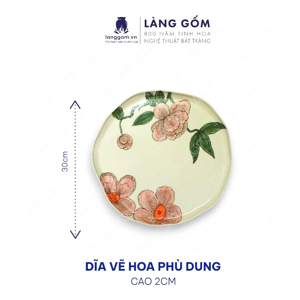 LÀNG GỐM Bat Trang Premium Hand-painted Hibiscus Distorted Ceramic Plate for Serving & Decoration