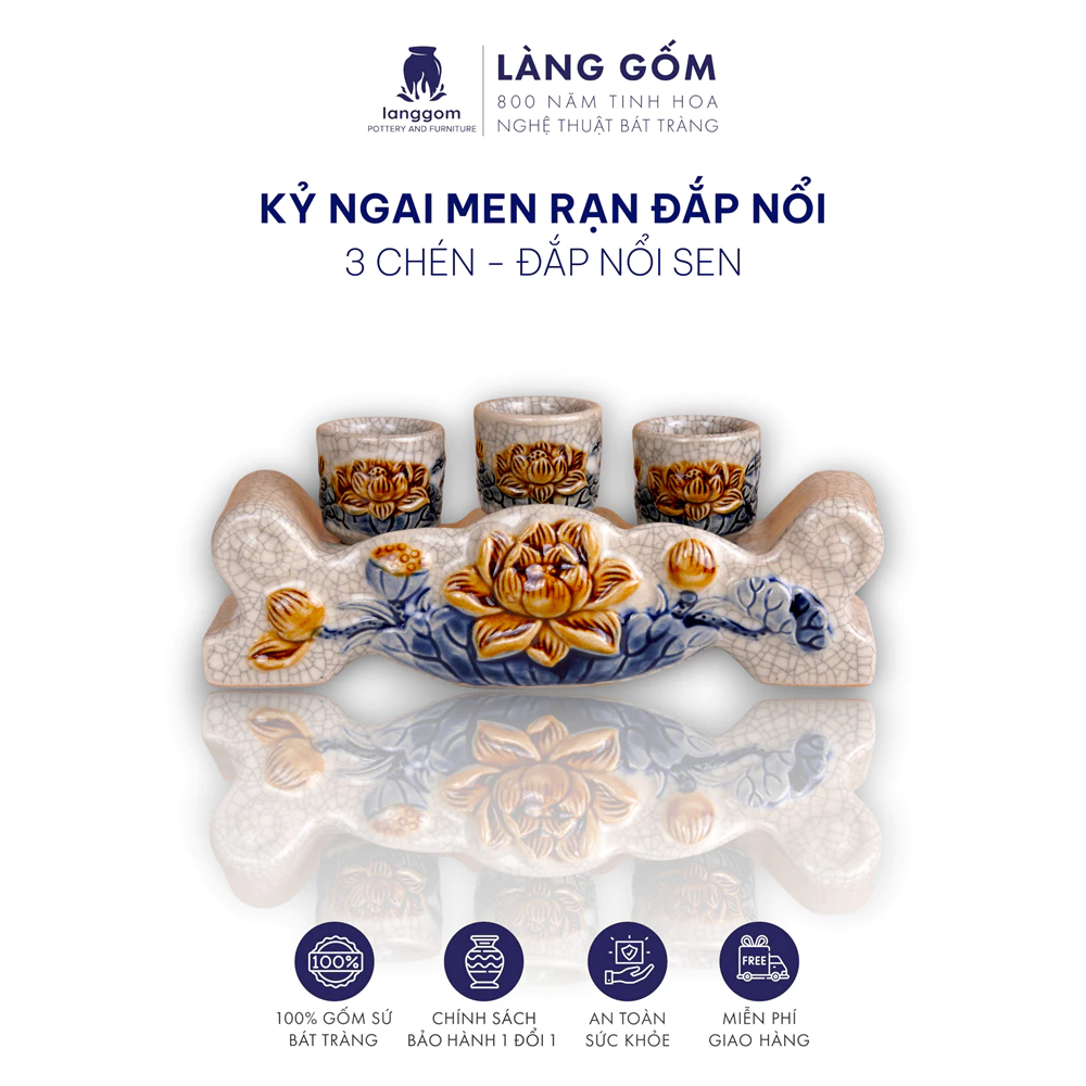 Ceremonial Altar Stand & Cup Set - Bat Trang Cracked Glaze with Embossed Dragon & Lotus (3 or 5 Cups)