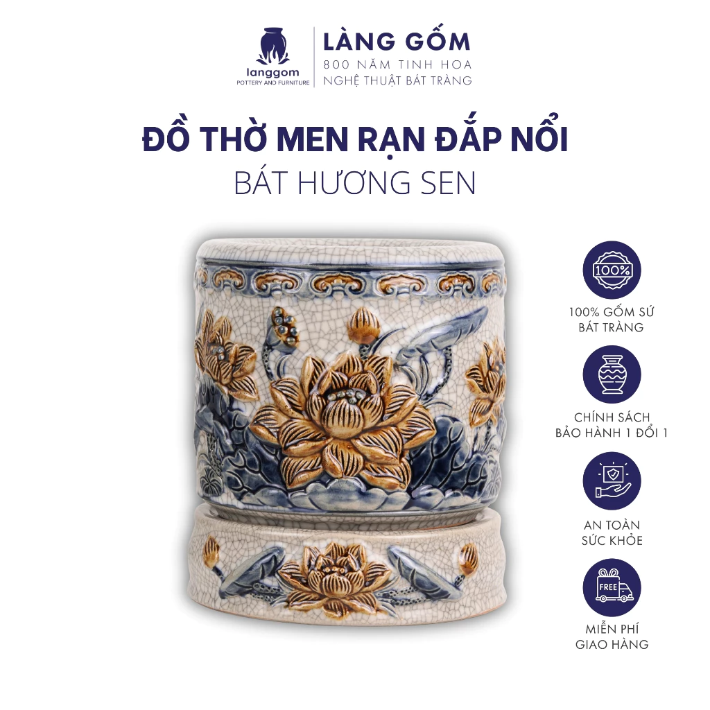 Bat Trang Ceramic Lotus Embossed Crackle Glaze Altar Set (Incense Burner, Incense Holder, Censer with Pedestal) - Vietnamese High-Grade Porcelain