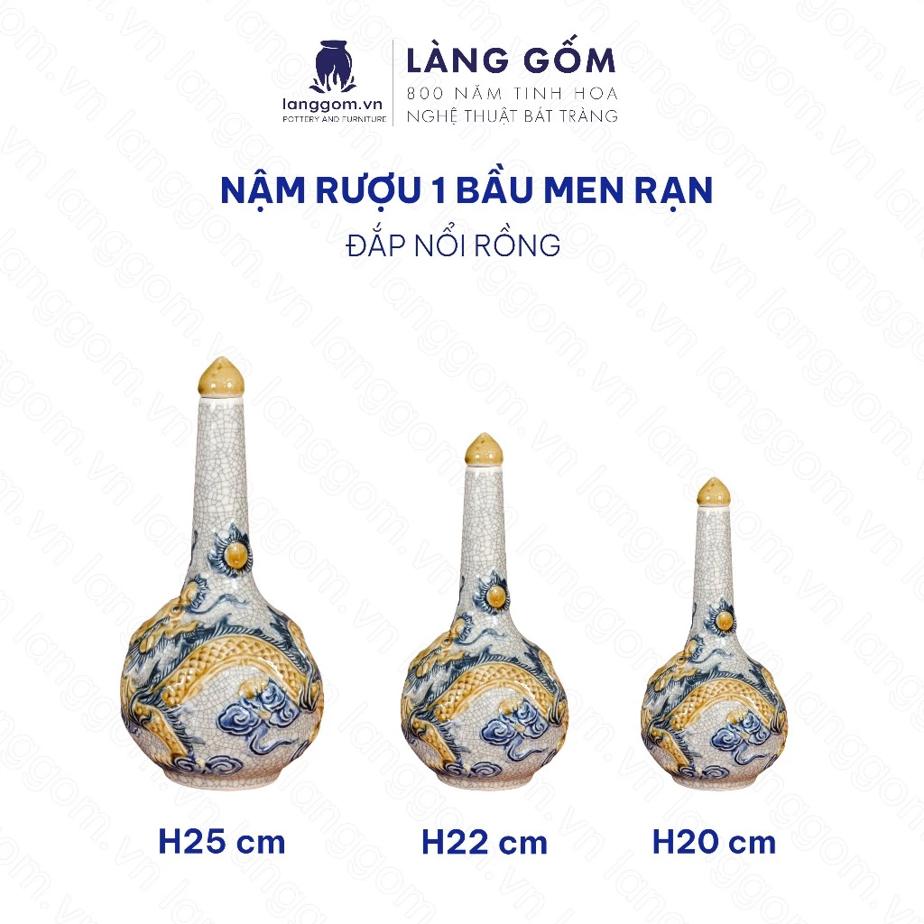 Bat Trang Pottery Ritual Wine Bottle (Single Bulb Shape) - Exquisite Embossed Dragon & Lotus Motif with Crackle Glaze - Lang Gom