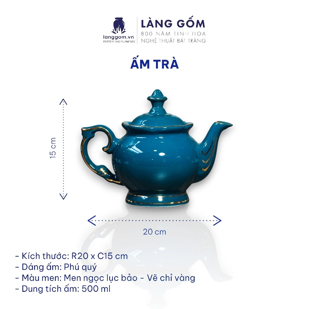 LÀNG GỐM' Bat Trang High-Grade Tea Set 'Phú Quý' Emerald Green Gold Rim - Luxurious 7-piece Set
