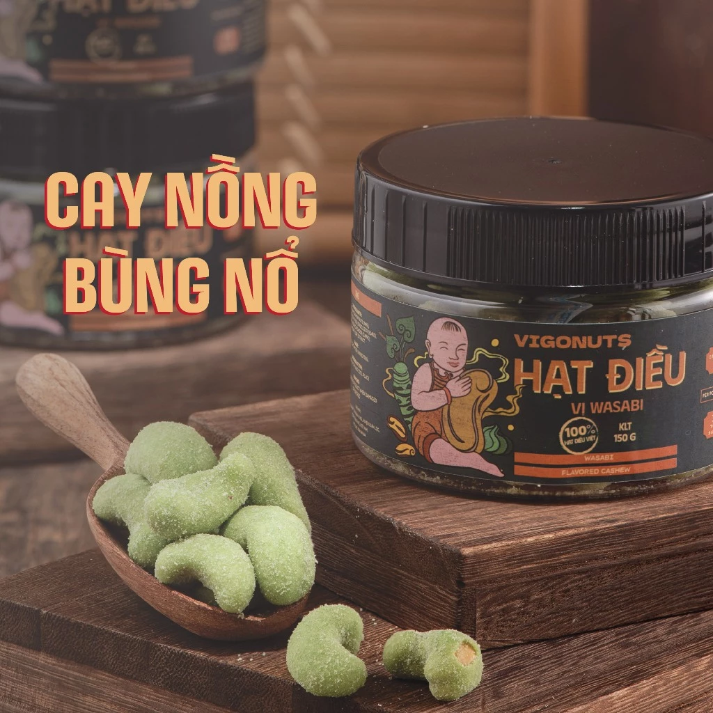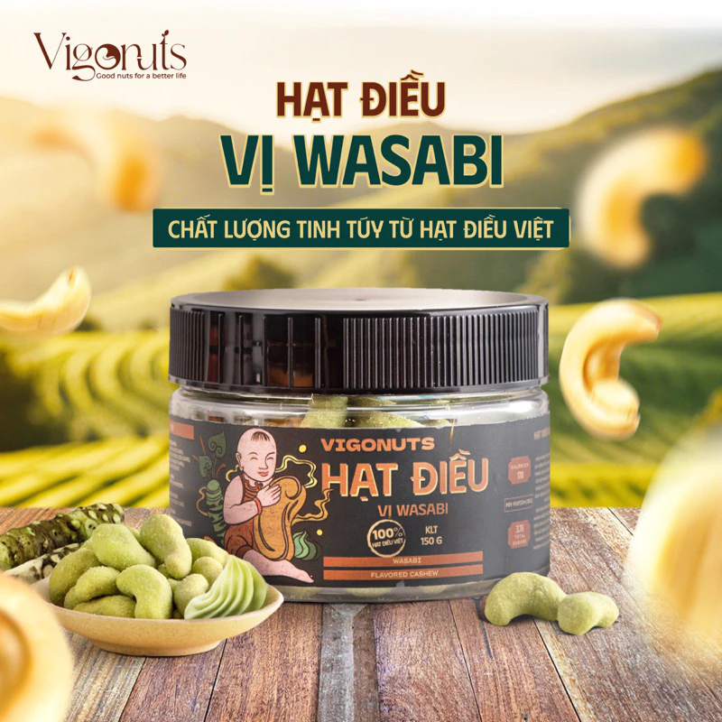 VIGONUTSの「わさび味カシューナッツ」は、ピリッと刺激的なわさびの風味と、ベトナム産カシューナッツ本来のまろやかな甘さ、そして香ばしい塩味が絶妙に融合した、まさに味覚の爆弾です。