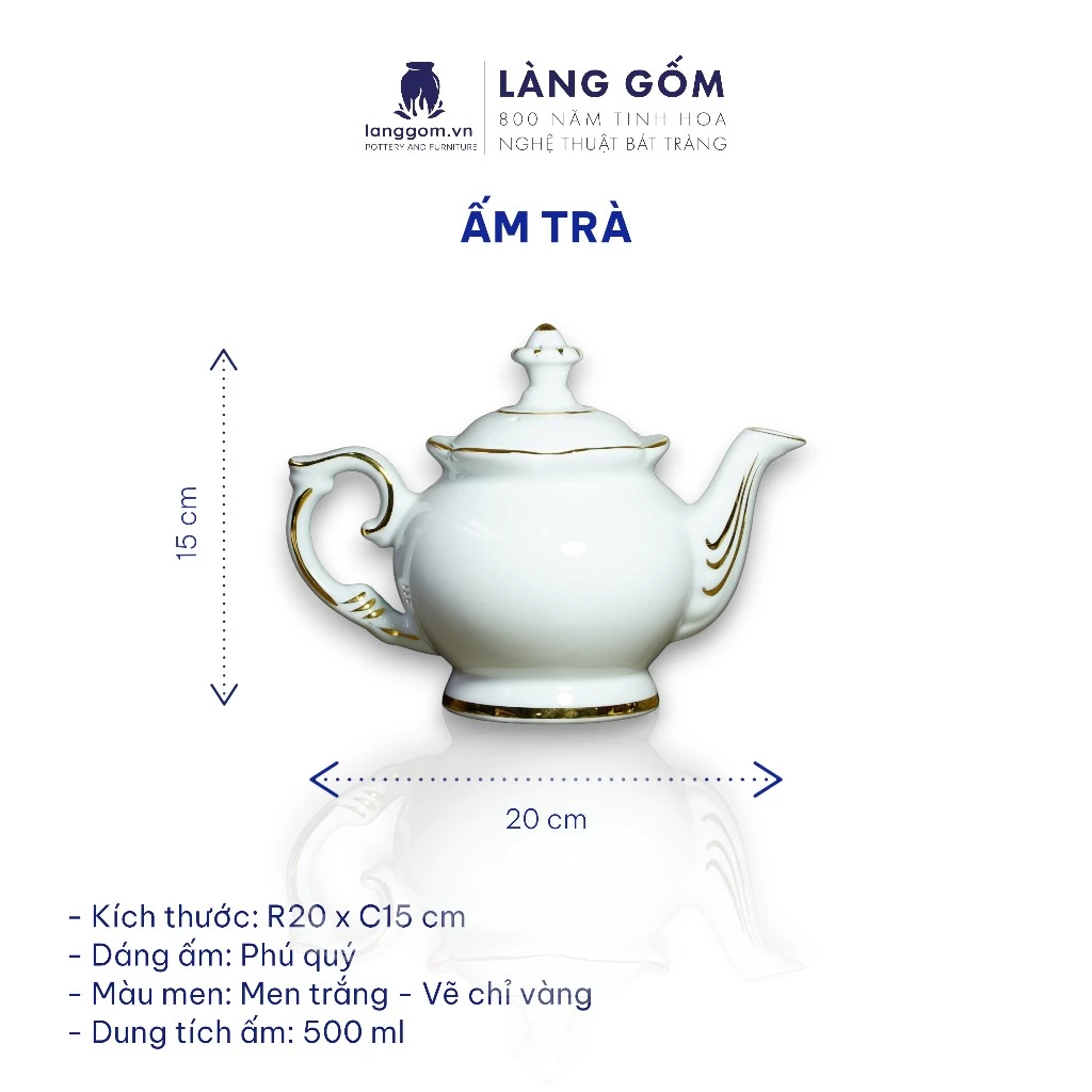 LÀNG GÔM Premium Bat Trang White Glaze Gold Trim Tea Set - 'Phu Quy' Prosperity Collection - Vietnamese Traditional Craft