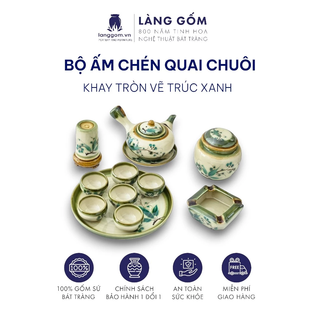 Hand-painted Green Bamboo Ceramic Tea Set with Round Tray - Bat Trang Pottery Vietnam