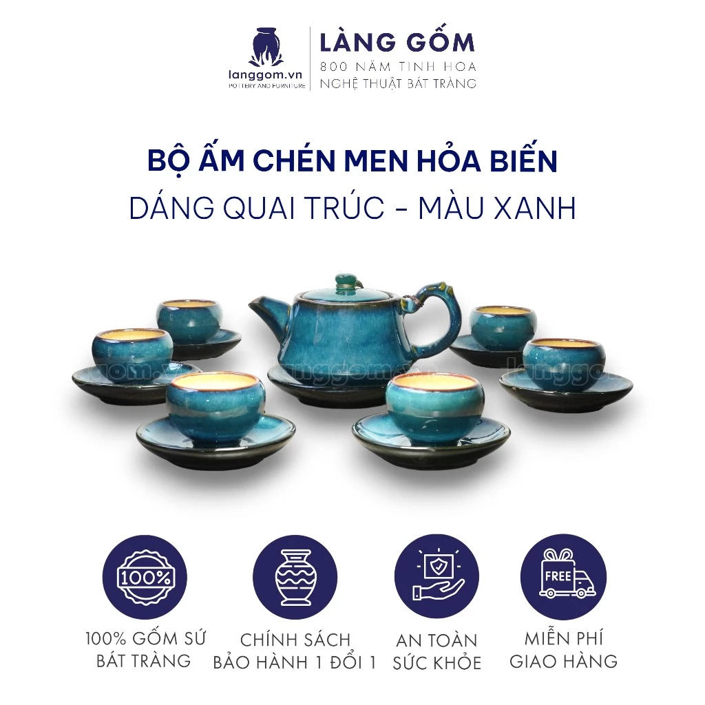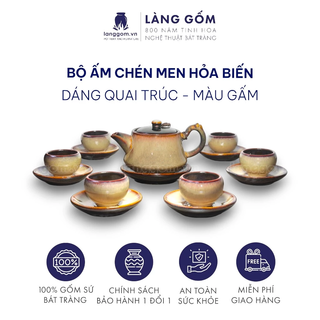 竹を模した優雅な取手と、湯呑の内側に繊細に描かれた花柄が、この茶器セットに一層の魅力を添えています。Làng Gốm(ランゴム)では、最高の美意識と品質基準で選ばれた火変釉茶器セットをお客様にお届けします。