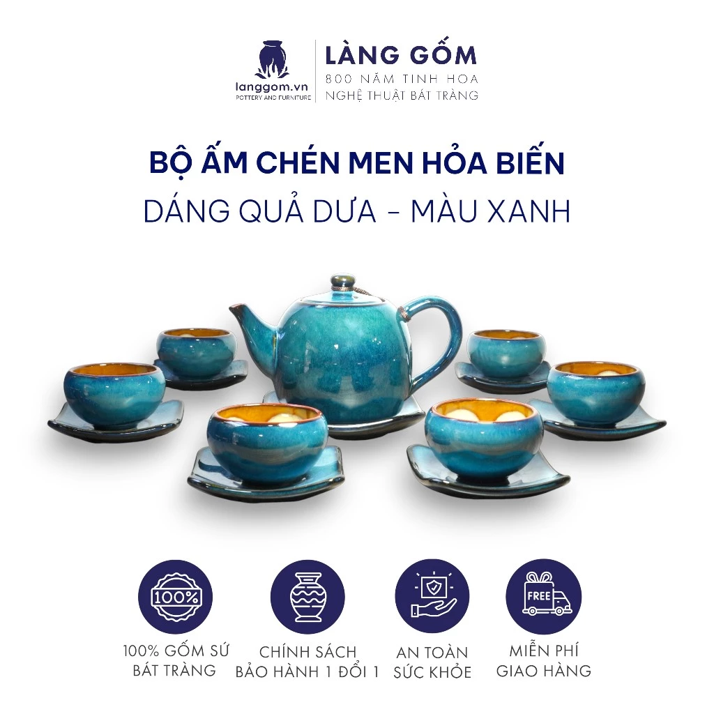 Premium Bat Trang Ceramic Gourd-Shaped Teaset with Fire-Glazed Enamel & Floral Inner Cups (M) - Lang Gom