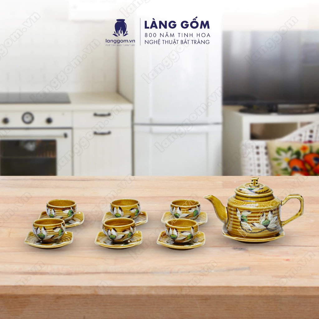 Bat Trang Flame-Glazed Cross Pattern Tea Set - Artisan Ceramic Masterpiece