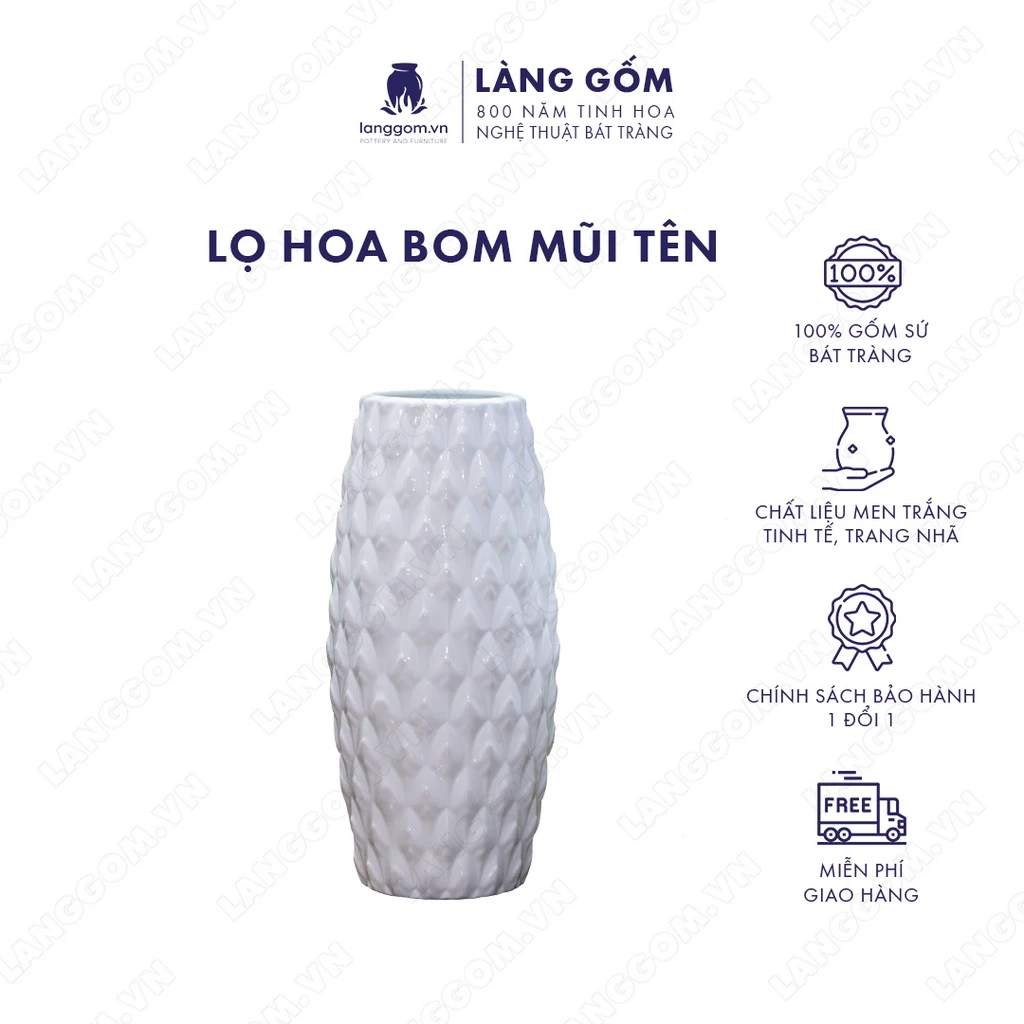LÀNG GỐM Premium Bat Trang Ceramic Arrowhead Decorative Vase, White Glaze, Tabletop