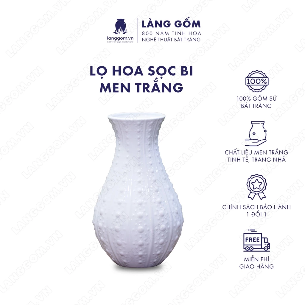「LÀNG GỐM 高級バッチャン焼き 白磁ストライプドット花瓶 (卓上装飾用)」は、ベトナム伝統の高級バッチャン焼き陶磁器で作られた、洗練された花瓶です。