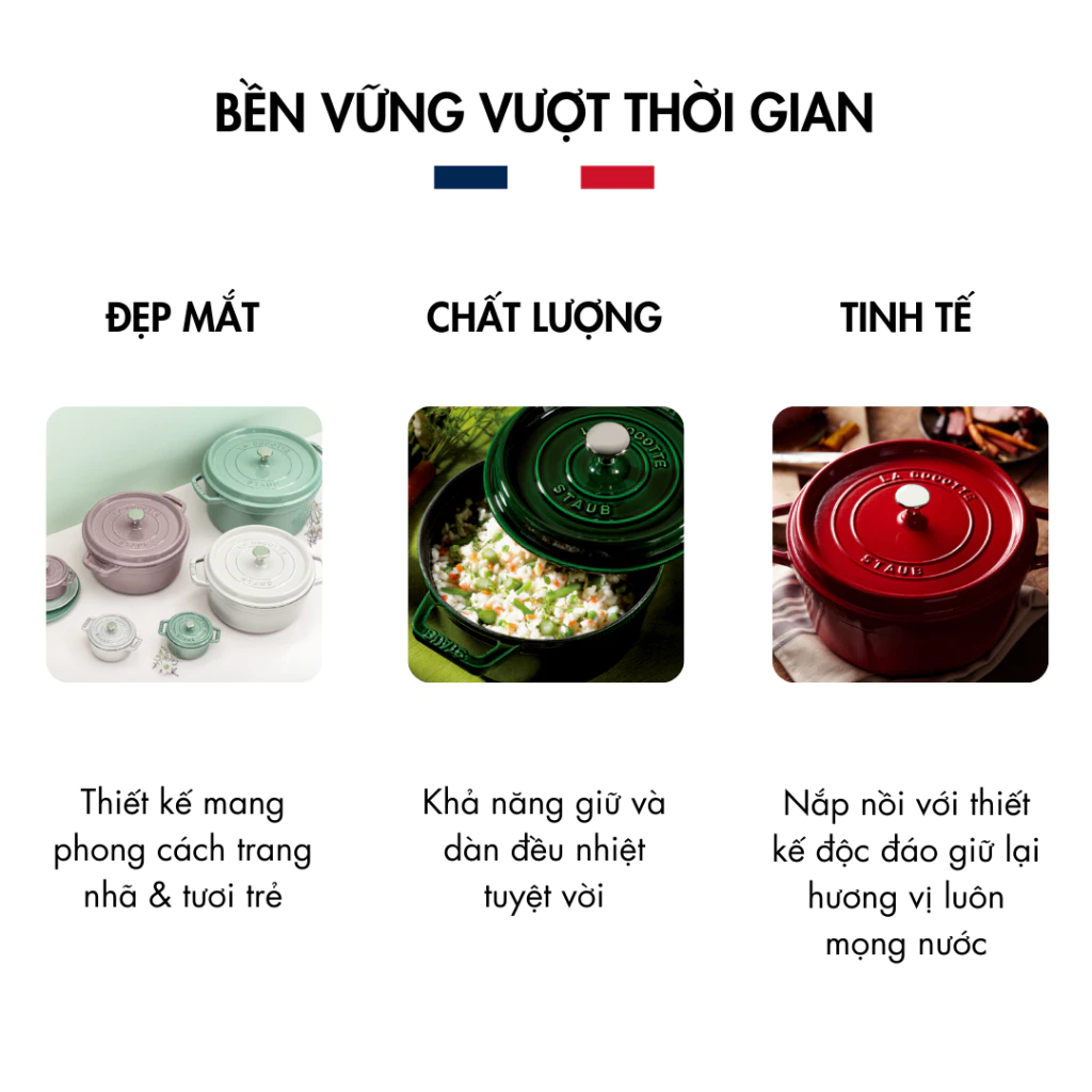 ガスコンロ、IHクッキングヒーター、オーブンなど、あらゆる熱源に対応。美しいデザインは、調理後そのまま食卓に出しても様になり、おもてなしの席でも活躍します。STAUBのソテーパンで、日々の食卓を豊かに、そして特別なものに変えてみませんか?