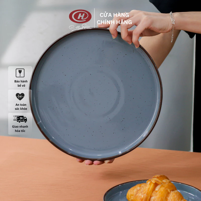 Minh Chau Japanese Style Salt & Pepper Glaze Rimmed Blue Porcelain Flat Plates - 2 Sizes