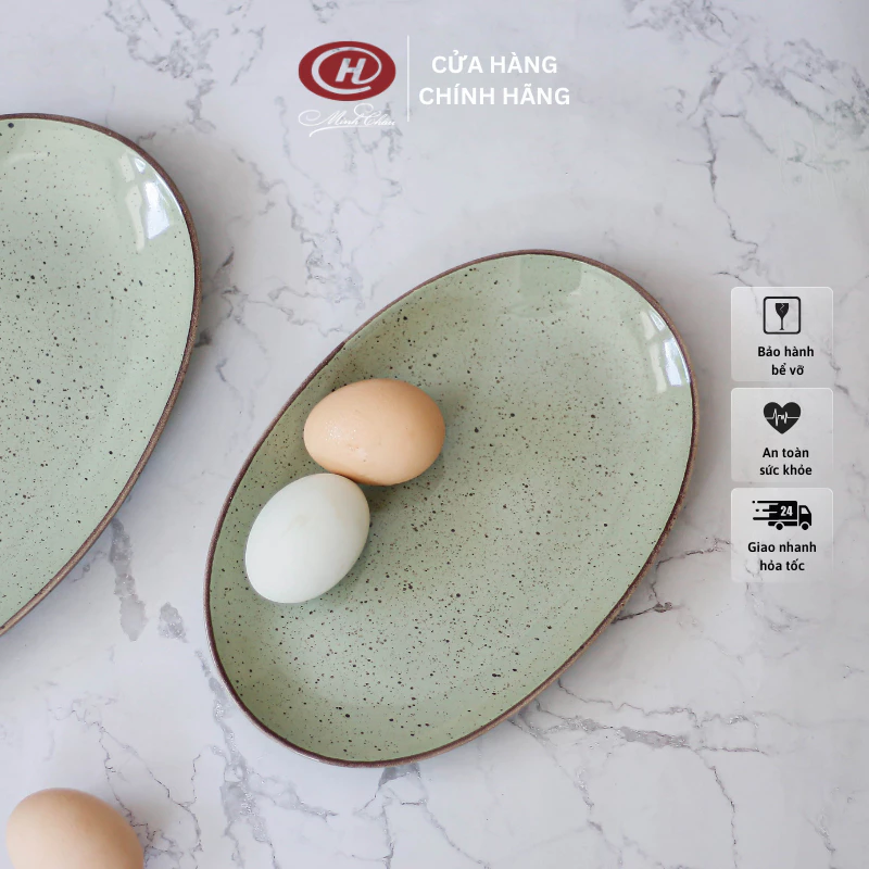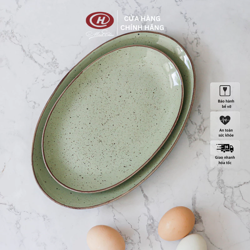 Minh Chau Ceramic Japanese Style Mango Oval Plate - Green Salt & Pepper Glaze