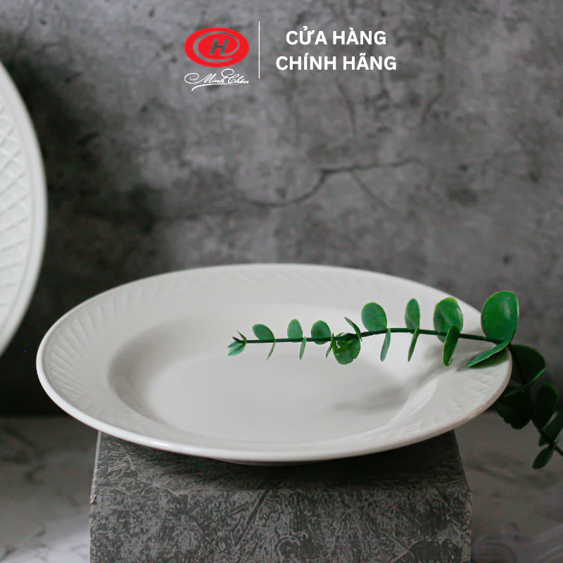 Minh Chau Deep Ceramic Plate with Textured Rim - Plain White - Vietnamese High-Quality Dinnerware
