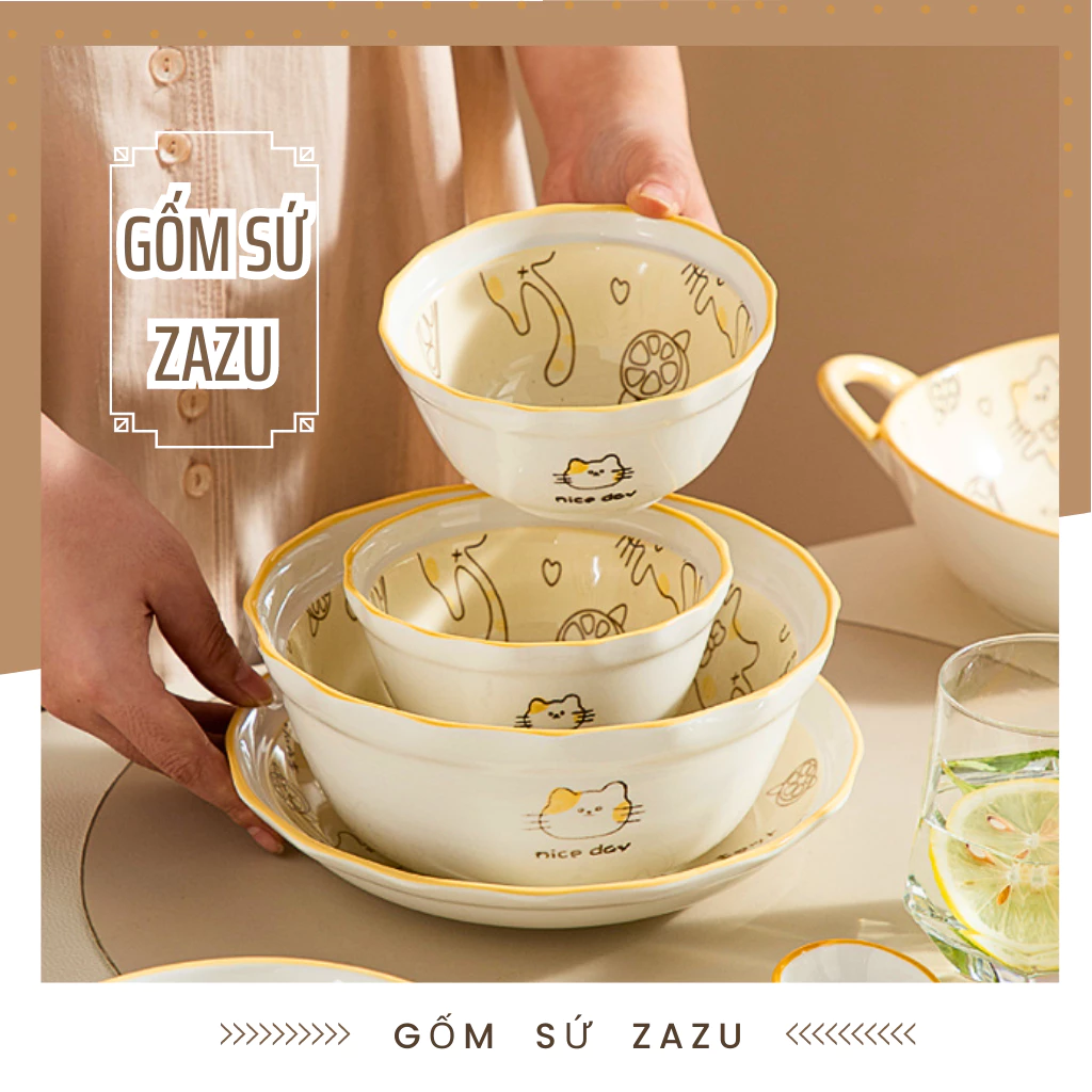 Gốm Xuân Xưa Cat Motif Dinnerware Series | Adorable Ceramic Plates & Bowls (Sold Individually)