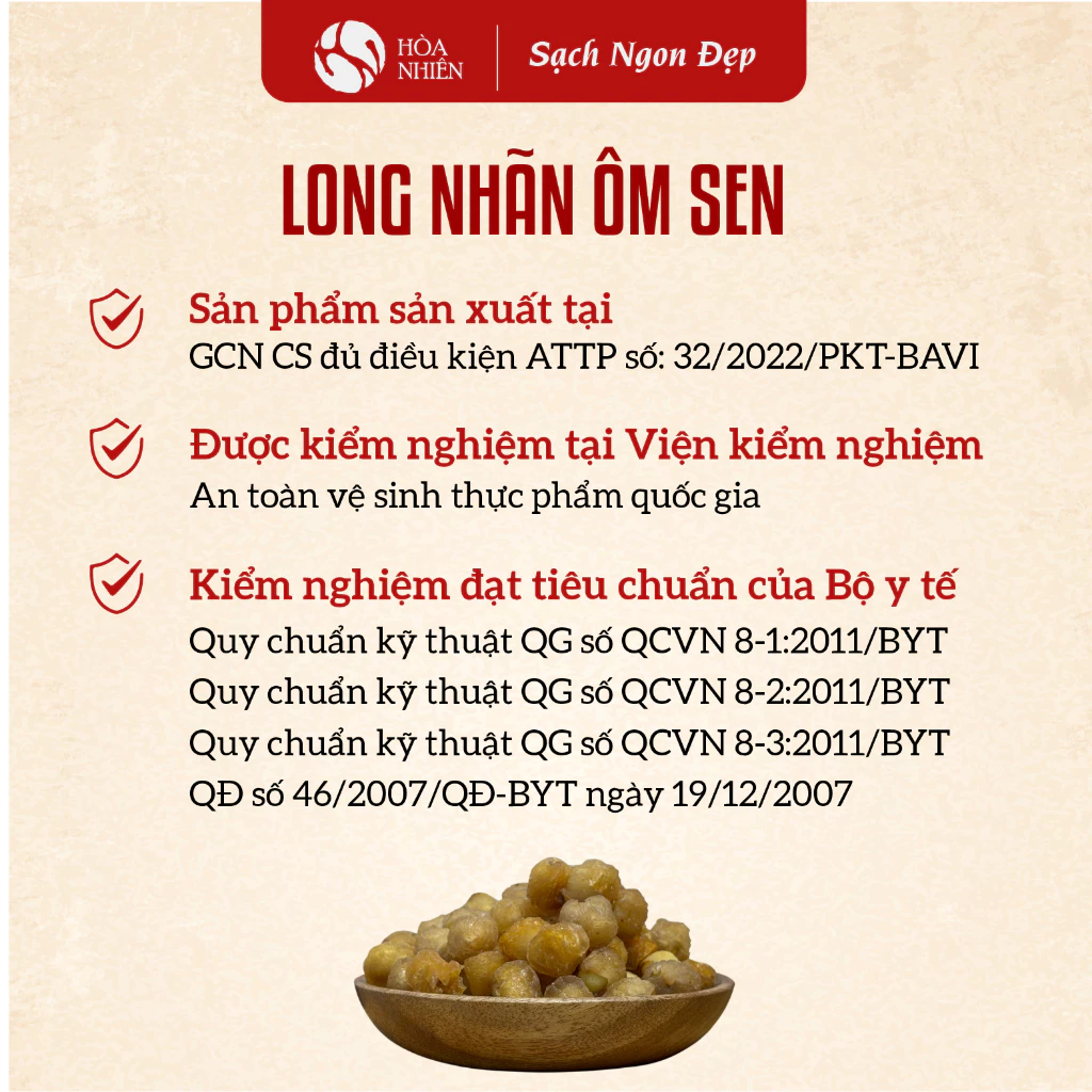 ブランド「ホアニエン」(「Cửa hàng Bản Sướng」運営)が自信を持ってお届けするこの商品は、食品安全認証取得済みの施設で製造されています。さらに、ベトナム国立食品衛生研究所による厳格な検査をクリアし、ベトナム保健省の定める全ての基準に適合していることが確認されています(公示番号: 016-TCB/CHBS)。