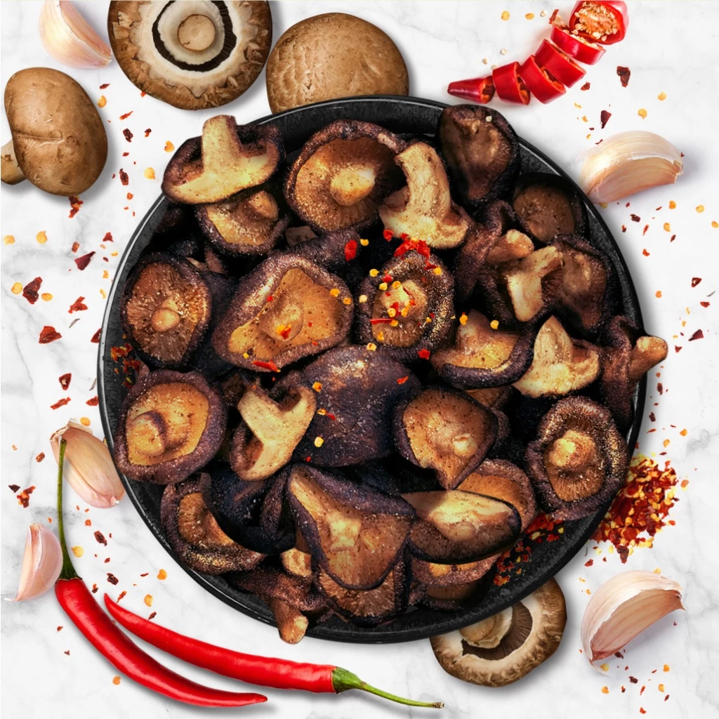 新鮮な肉厚しいたけを厳選し、特殊な真空フライ製法でカリッとした食感と栄養をそのままに閉じ込めました。一口食べれば、しいたけ本来の旨味に、パンチの効いたガーリックとピリ辛のチリが絶妙に絡み合い、一度食べたら止まらない美味しさです。一般的なスナックとは異なり、MSG(化学調味料)、人工着色料、保存料は一切不使用。純粋な植物性素材のみで作られたヴィーガン対応商品です。