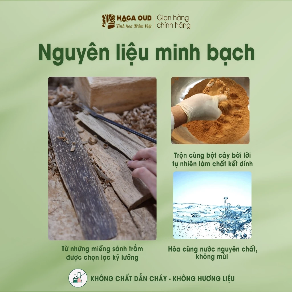 「HAGA 3クリーン 純粋沈香つぼみ線香」は、ベトナムの信頼できるブランド「Trầm Hương HAGA」が自信を持ってお届けする製品です。100%純粋な沈香粉と天然のボイロイ木粉、水のみで作られており、「3クリーン」の基準(健康にクリーン、空間にクリーン、心にクリーン)を満たしています。リン酸や有害なベンゼン環などの化学物質は一切使用しておらず、ISO 9001:2015認証も取得しているため、高齢者や小さなお子様がいるご家庭でも安心してお使いいただけます。