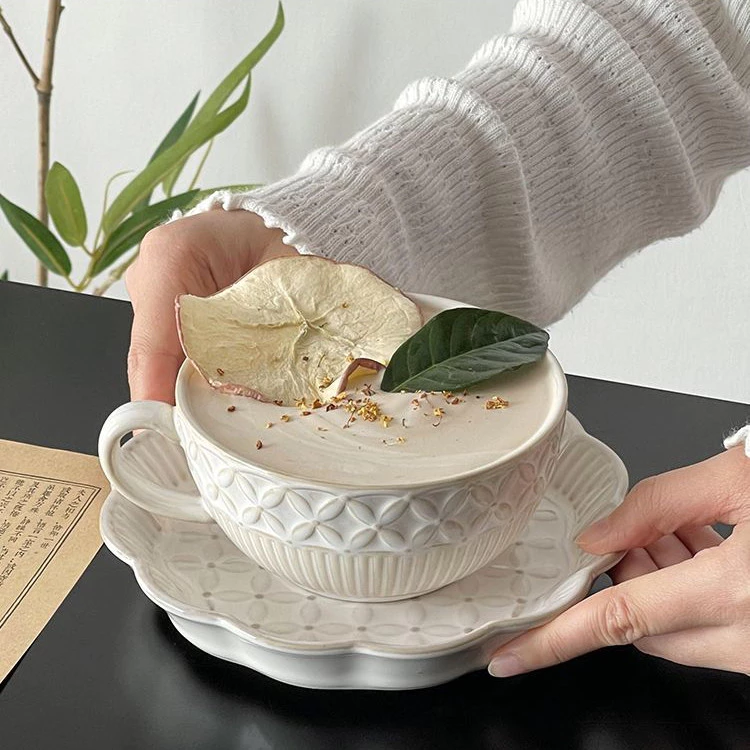 300mlアンティーク調エンボス加工クラシック陶器コーヒー&ティーカップセット - 芸術的な古びた加工で午後のティータイムをの通販・個人輸入代行販売商品