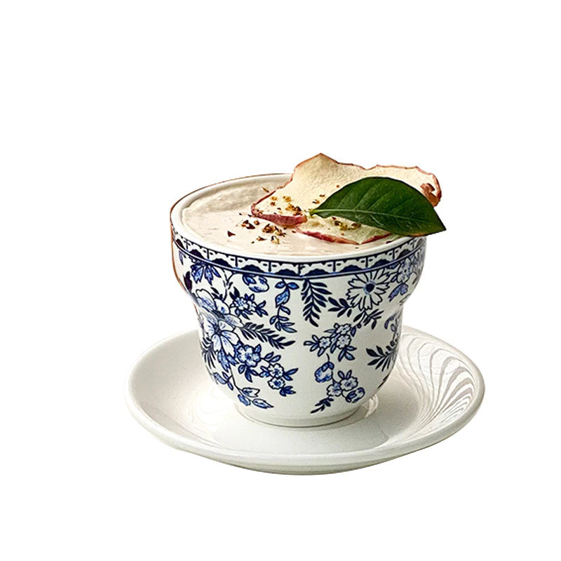 カップの絵付けは、青花磁器の古典的なテーマを創造的に再解釈したものです。