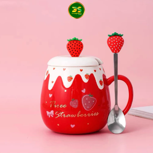 Strawberry Pattern Ceramic Mug 400ml with Lid & Spoon Set - Cute Desk Item