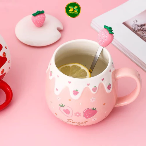 Pink Strawberry Pattern Ceramic Mug 400ml with Lid & Cute Spoon