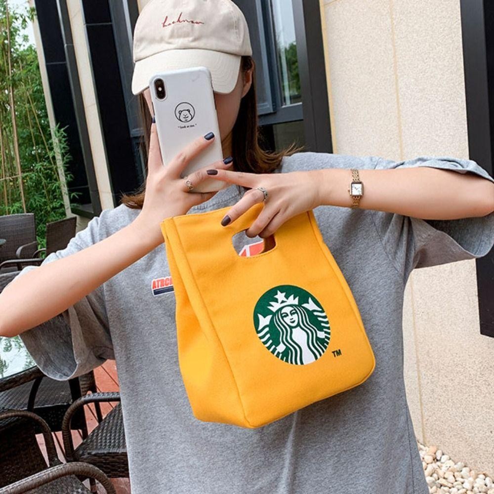 Yellow Starbucks Print Canvas Shoulder Bag - Korean Style Easy to Match Daily Tote Bag