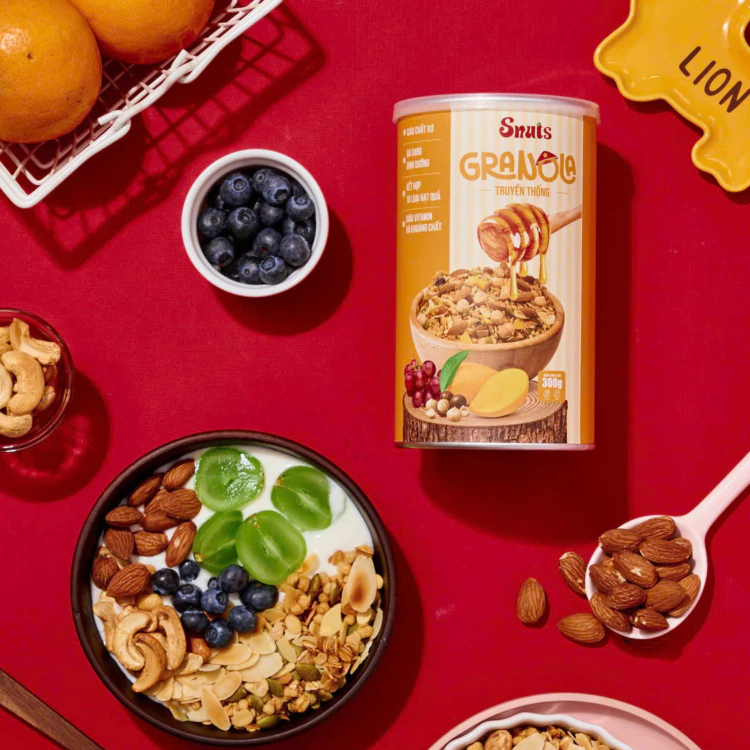 - ヨーグルト/牛乳と一緒に:最も一般的な食べ方です。30〜50gのグラノーラを牛乳(無糖/低糖)、ナッツミルク、またはヨーグルト(ギリシャヨーグルト/無糖)に混ぜて、バランスの取れた朝食や間食としてお召し上がりください。